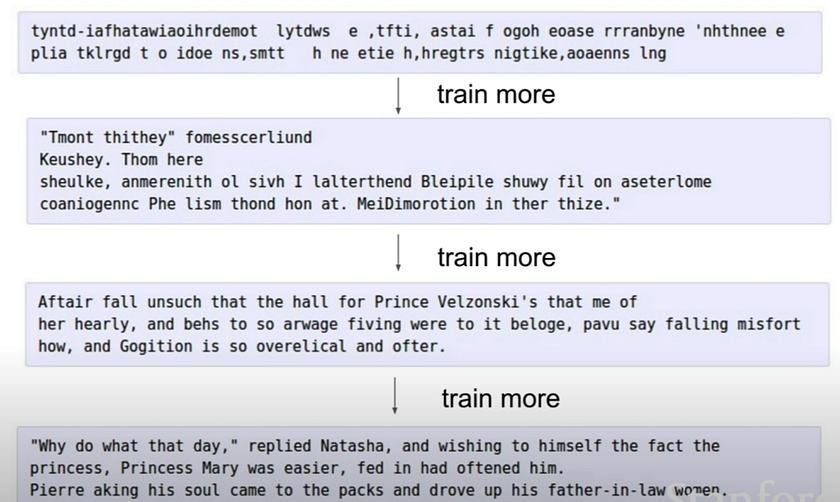Through the training process, the model gradually learns to make better predictions by adjusting its parameters based on the observed data and the computed gradients. As you can see from the image above, through gradual training, the result generated sentences that are more coherent, structured, and meaningful.