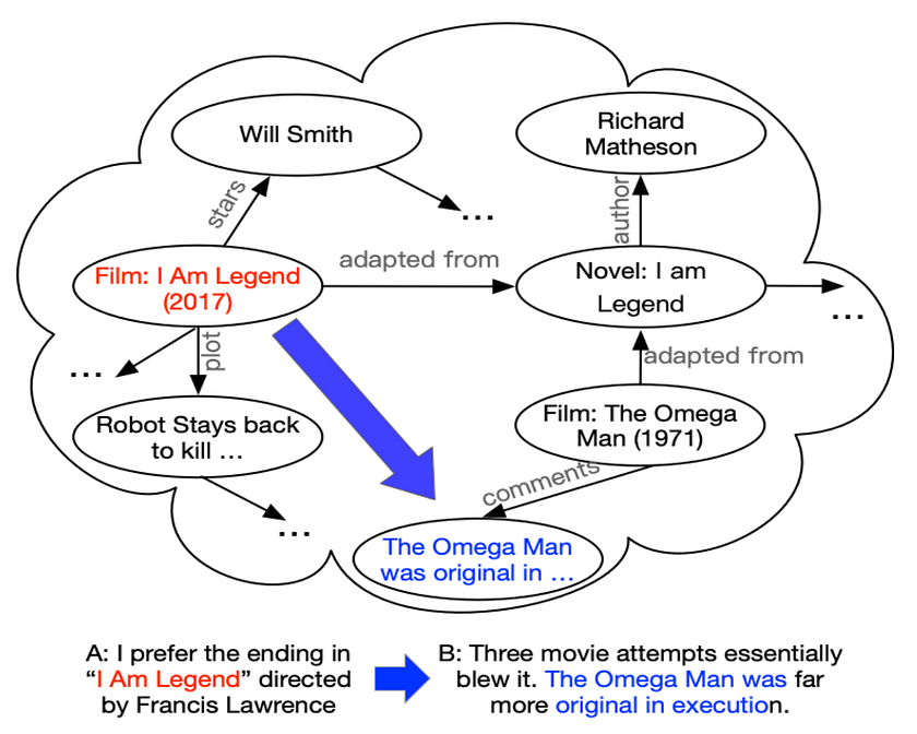 Having a conversation is like moving from one node to another in a KG, also referred to as multi-hop graph reasoning. With this idea, the Augmented Knowledge Graph based open-domain Chatting Machine (AKGCM) was introduced in 2019, which combined KGs and text data. The KGs allowed the machine to identify relevant topics to respond with, while the text data gave the machine the words it needed to express itself. An example conversation is in the image below, where a user discusses the movie “I Am Legend” and the model identifies “The Omega Man” as a related movie and comments about it in response. Subsequently, the paths through the KG were studied to understand how the model functioned and what it learned.