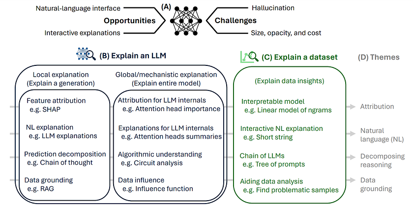 The techniques of employing LLMs to generate explanations for other resources like datasets are depicted in panel (C) of the above image. LLMs can provide natural language explanations that are easy to understand and are interactive, as they allow for conversation for users to seek further clarification. The second path of explaining LLMs themselves, which we are focusing on in this article, encompasses many techniques detailed in panel (B). For example, in chain of thought prompting, the LLM is asked to explain its reasoning process step-by-step before arriving at its answer.