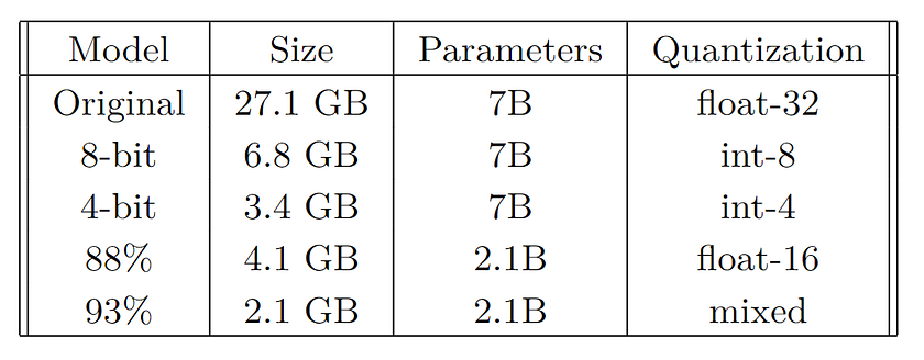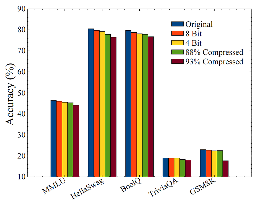 Despite having 70% fewer parameters, both compressed models experienced only a 2% to 3% drop in performance accuracy compared to the original model. This was observed across five benchmarks for language understanding (MMLU), commonsense reasoning (HellaSwag), reading comprehension (BoolQ), world knowledge (TriviaQA), and maths (GSM8K).