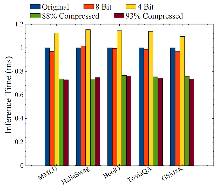 Furthermore, the compressed versions experienced a speedup in inference time as they completed inference tasks in 75% of the time taken by the other models.