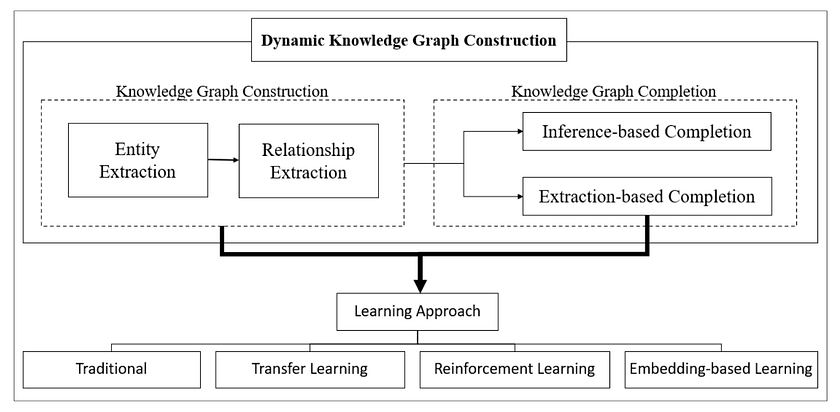 The construction of DKGs is not vastly different from that of standard KGs. Standard KGs are formed in the KG construction phase, which involves entity and relationship extraction that can be further broken down into various natural language processing subtasks. For DKGs, an additional KG completion phase is employed. This phase is responsible for dynamically updating or adding new nodes and relations to an existing KG and can be achieved in two ways: