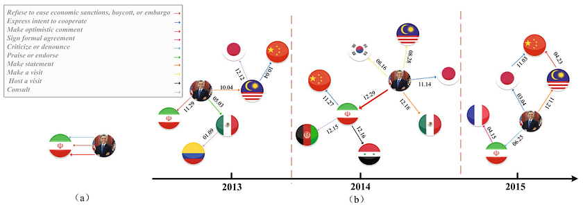 When we introduce temporal data, for instance in the image above in panel (b), we see that Obama’s actions toward Iran occurred in three distinct years from 2013 to 2015 and were tied to actions by other countries. This added context makes the information a lot more understandable.