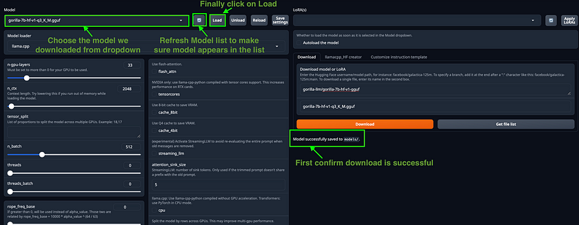 http://127.0.0.1:7860/- Selecting a Quantised Model: Within the application, navigate to the “Model” tab. Choose the quantised model you’d like to use by copying its name from the indicated Hugging Face repository and pasting it into the appropriate field. After the model has been successfully downloaded, refresh the model list. Then, select your model and click on the