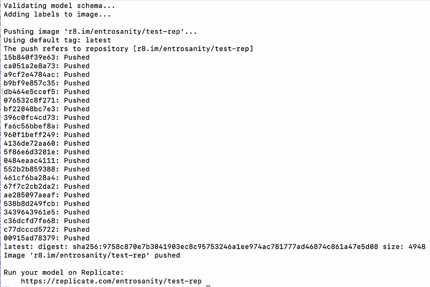 - Publishing the Docker Image to Replicate: Once your Docker image is built and you are logged in, the next step is to push the image to Replicate’s registry. This makes it available for running on Replicate’s platform. Replace <your-username> with your actual Replicate username and <your-model-name> with the name you have assigned to your model on Replicate. Use the following command to upload your image: