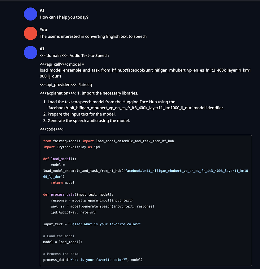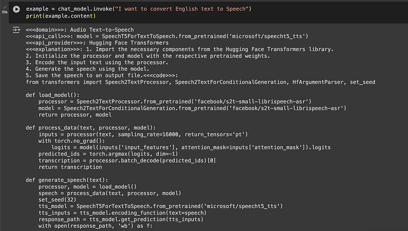 chat_model = ChatOpenAI( openai_api_base="http://zanino.millennium.berkeley.edu:8000/v1", openai_api_key="EMPTY", model="gorilla-7b-hf-v1", verbose=True )- Example: Demonstrate how to use the configured Langchain chat agent to perform tasks, such as converting English text to speech. Here, the invoke method is called with a specific request, and the response content is printed to showcase the result.