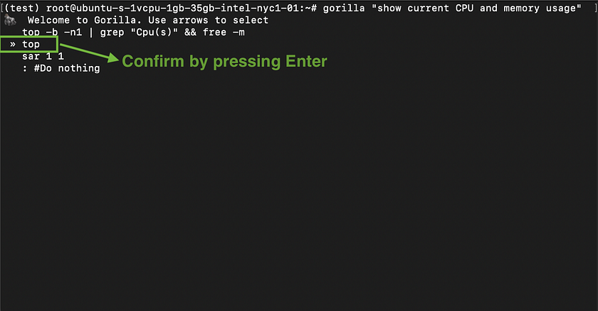 gorilla "your query"- Example: For a practical application, enter the below query into the terminal. This command allows you to monitor the current CPU and memory usage directly from the command line, showcasing Gorilla CLI’s utility in system monitoring. Gorilla CLI will generate multiple candidate commands that could potentially accomplish the user’s query. Users can then toggle through the commands using arrow keys and select the desired one by pressing Enter.