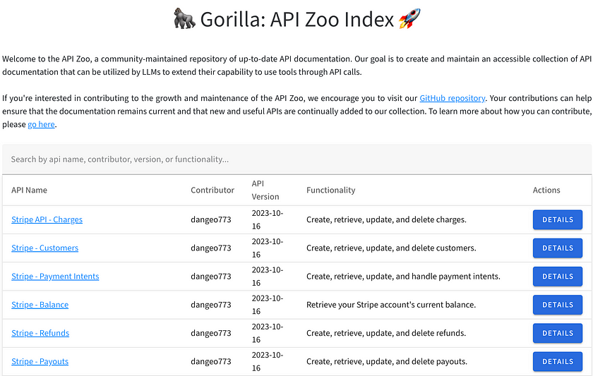 - Gorilla API Zoo — Access to various APIs provided by Gorilla for developing applications. Visit API Zoo.