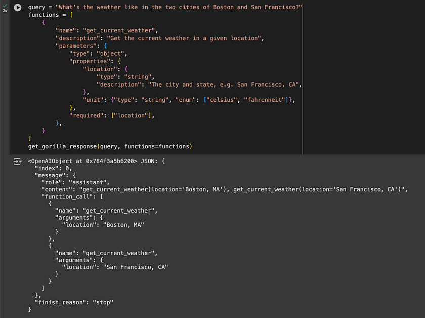 print(e, model, prompt)- Utilising Gorilla OpenFunctions: In this example, the function queries the weather in Boston and San Francisco using a predefined function for weather retrieval. Gorilla returns a readily accessible string and an OpenAI-compatible JSON, facilitating easy integration and further processing: