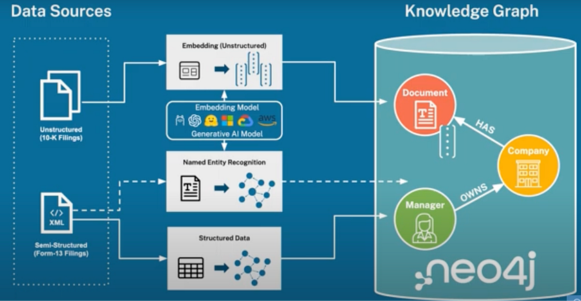 To construct a Neo4j knowledge graph, the information is organised into nodes and relationships. For unstructured data like 10-K filings, the approach involves creating “document” nodes. Each document node corresponds to a segment of text from a 10-K filing, utilising an embedding model from the GenAI service to generate vectors for these nodes, which later facilitates vector search capabilities. For semi-structured Form 13 filings, the system employs Cypher templates to input the data in a structured manner, creating “company” and “manager” nodes and building an “owns” relationship between them while linking back to the document. Additionally, an alternative method for ingesting Form 13 uses named entity recognition powered by a LLM from the GenAI service provider, offering a more robust way to handle filings that may be malformed, inconsistent, or semi-structured XML.