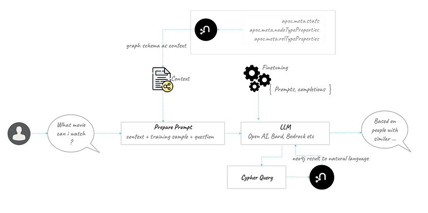 - Contextual Setup: NeoConverse prepares the LLM by providing it with the schema information that is stored in the Neo4j database and a few relevant data examples to guide the model.