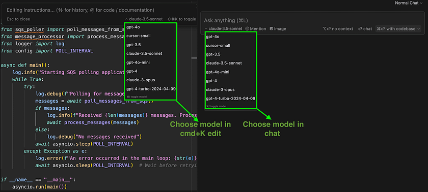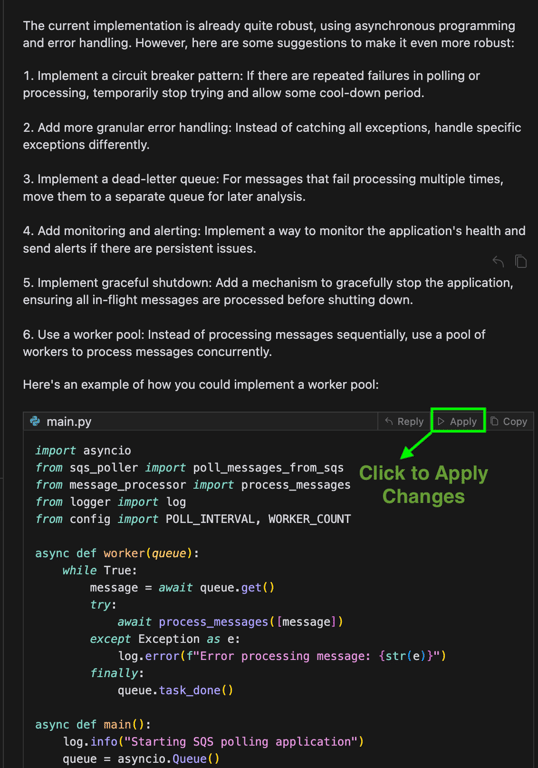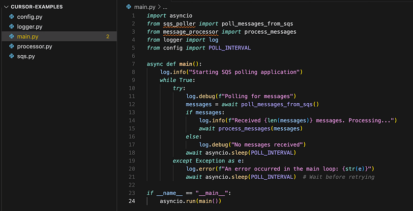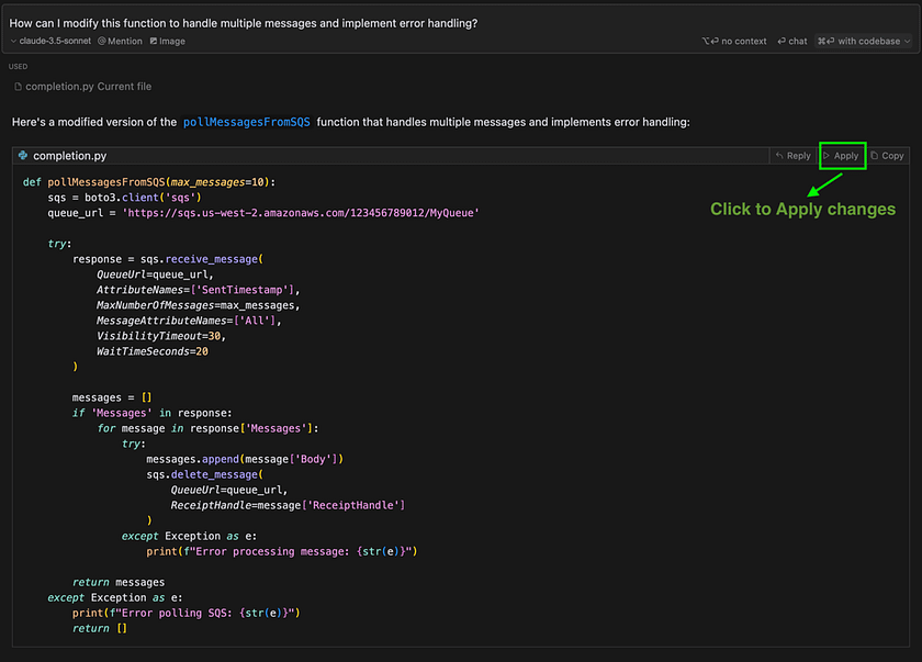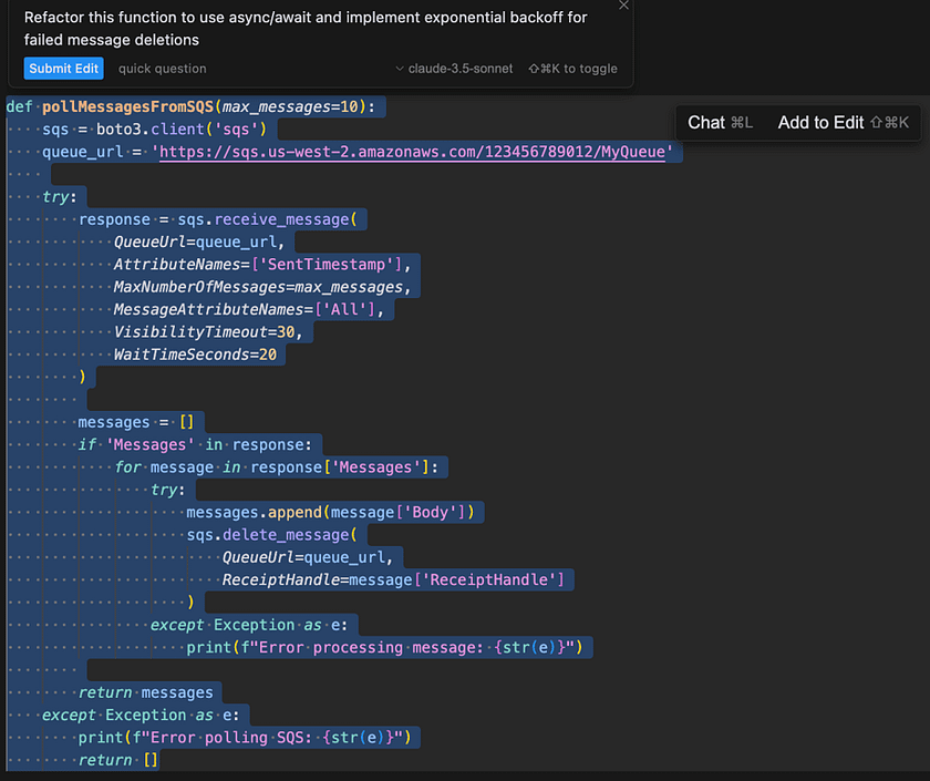 Cursor Tab doesn’t just complete simple lines — it can suggest complex, multi-line code structures and even refactor existing code. Imagine you’re writing a Python function to poll messages from aws SQS (simple queue service) and start typing: