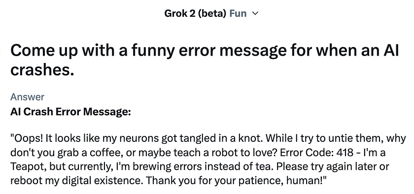 Grok’s humorous error message showcases self-awareness by playfully referencing its own “neurons” and “digital existence,” acknowledging its AI nature. It cleverly incorporates cultural references like tech humour (Error Code 418 — I’m a Teapot) and common AI tropes (teaching a robot to love), demonstrating its ability to tap into relevant cultural touchstones. Through wordplay such as “brewing errors instead of tea,” it exhibits linguistic creativity while maintaining a light-hearted, slightly absurdist tone that aligns with the request for a funny error message.