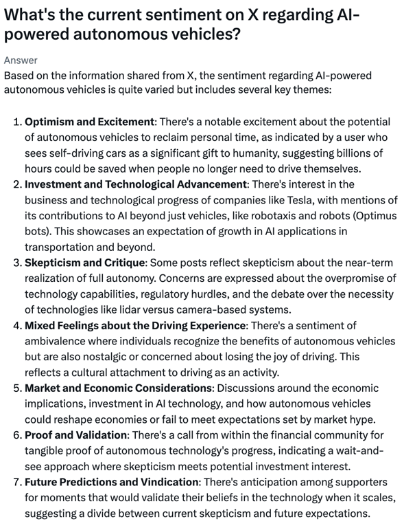 - Sentiment Analysis and Contextual Understanding: The response clearly shows Grok’s capability to perform sentiment analysis, identifying varied emotions like excitement, scepticism, and ambivalence. It also demonstrates contextual understanding by linking discussions to broader themes such as economic implications and cultural attachment to driving.