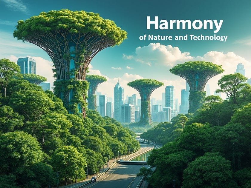 Generate an image of a futuristic cityscape where nature and technology coexist harmoniously. Include flying cars and tree-covered skyscrapers. Incorporate the text 'Harmony of Nature and Technology' prominently within the scene.