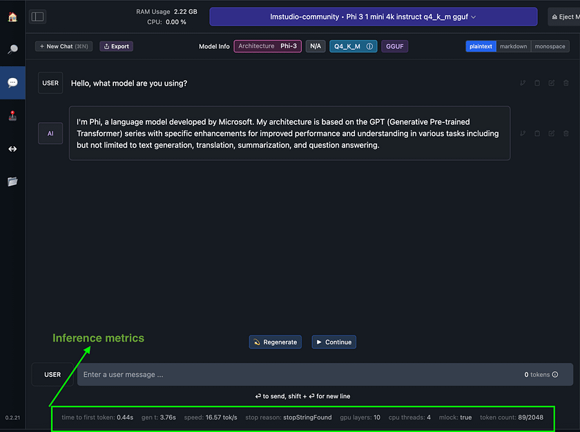 One of LM Studio’s standout features is its transparent display of inference metrics after each model response. As shown in the image, these metrics include time to first token, generation time, generation speed (tokens per second), stop reason, GPU layers used, CPU threads, whether memory-efficient inference (mlock) is enabled, and token count.