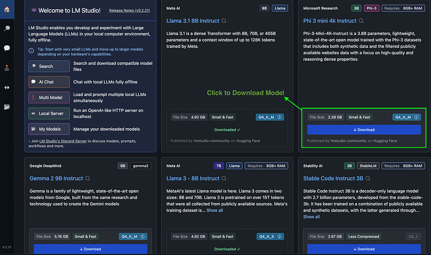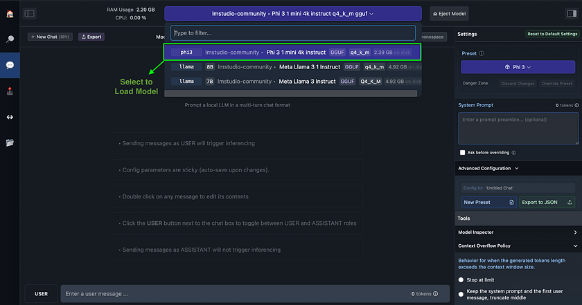 Now that you have LM Studio installed, let’s walk through the process of chatting with a local large language model. This example will demonstrate how to download a model, load it into memory, and engage in a conversation. We’ll use Phi 3 mini 4k Instruct as our example model, but the process is similar for other models available in LM Studio.