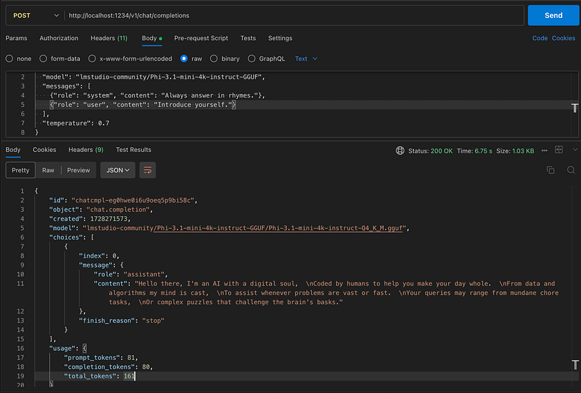 { "model": "lmstudio-community/Phi-3.1-mini-4k-instruct-GGUF", "messages": [ {"role": "system", "content": "Always answer in rhymes."}, {"role": "user", "content": "Introduce yourself."} ], "temperature": 0.7 }